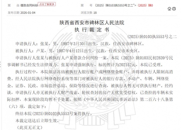 记者从中国裁判文书网查询到,《碑林区法院执行裁定书》【(2025)陕0103执5553号之二】显示,2025年12月15日,张某申请强制执行,被执行人卢某,标的暂计为202152元,本院已受理。
