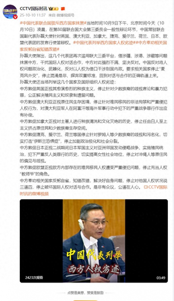 当地时间10月9日下午,北京时间今天(10月10日)凌晨,在第80届联合国大会第三委员会一般性辩论环节,中国常驻联合国副代表孙磊大使针对英国、澳大利亚、加拿大、捷克、爱尔兰、荷兰、日本、欧盟代表团的发言行使答辩权。