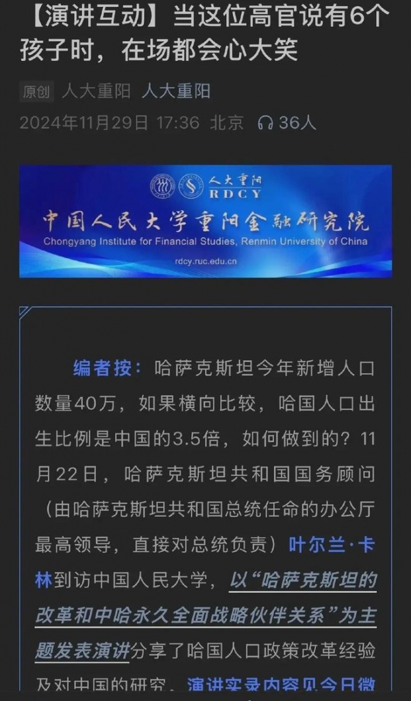 11月12日,哈萨克斯坦国务顾问叶尔兰.卡林到人民大学访问时,在一个互动环节上,人民大学教授向哈萨克斯坦国务部叶尔兰提出了一个问题,称他前段时间去哈萨克斯坦访问的时候,看到一个很好的现象,哈萨克斯坦街上、公园里孩子很多,想问对方是怎么做到让女大学生愿意生孩子的,不像我们国家的女同志,不愿意结婚,不愿意生孩子,家长也好,领导也好,你动员她,劝她都不听。