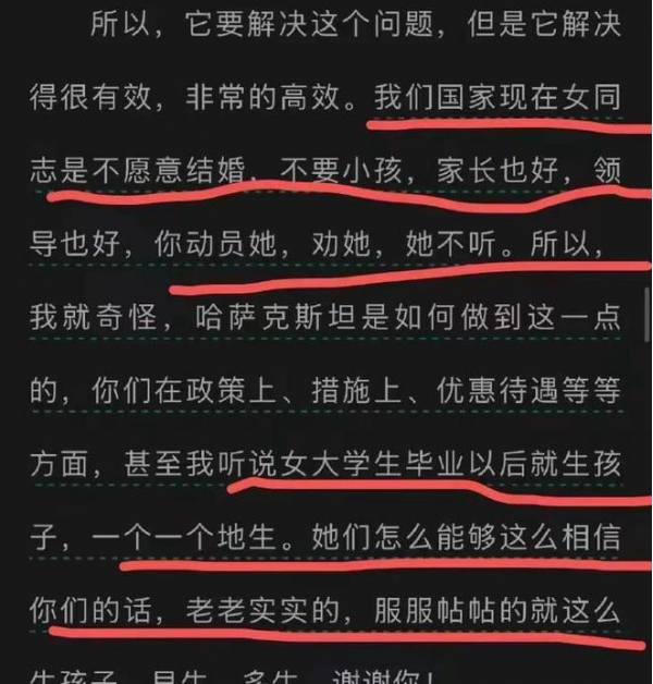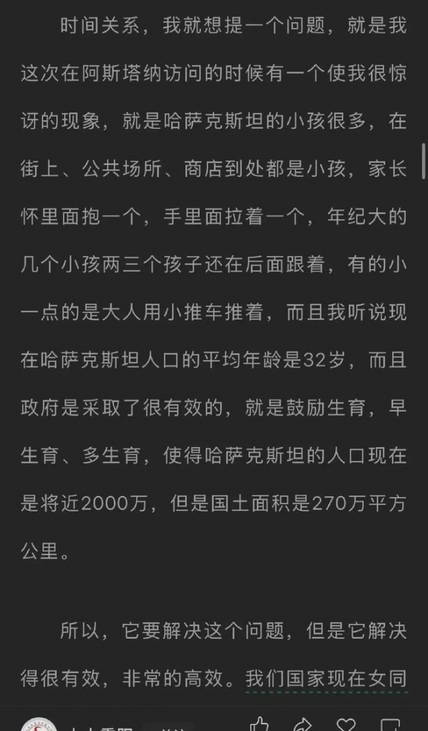 这位教授心是好的,就是在说话方面感觉他用词真的不对,王教授继续问对方:你们哈萨克斯坦是如何做到这一点的,你们在政策上,措施上,优惠待遇等等。听说女大学生毕业以后就生孩子,一个一个的生,他们怎么能够这么相信你们的话,老老实实的服服帖帖的就生这么多孩子,早生多生!
