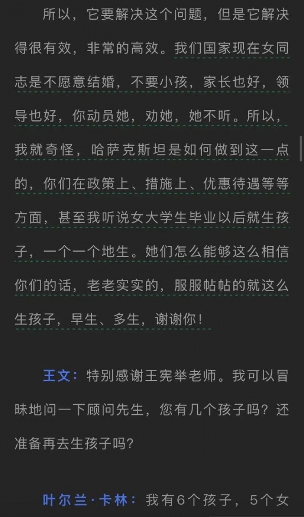 主持人也问了哈萨克斯坦这位国务顾问,对方生了几个孩子,还会继续生吗?