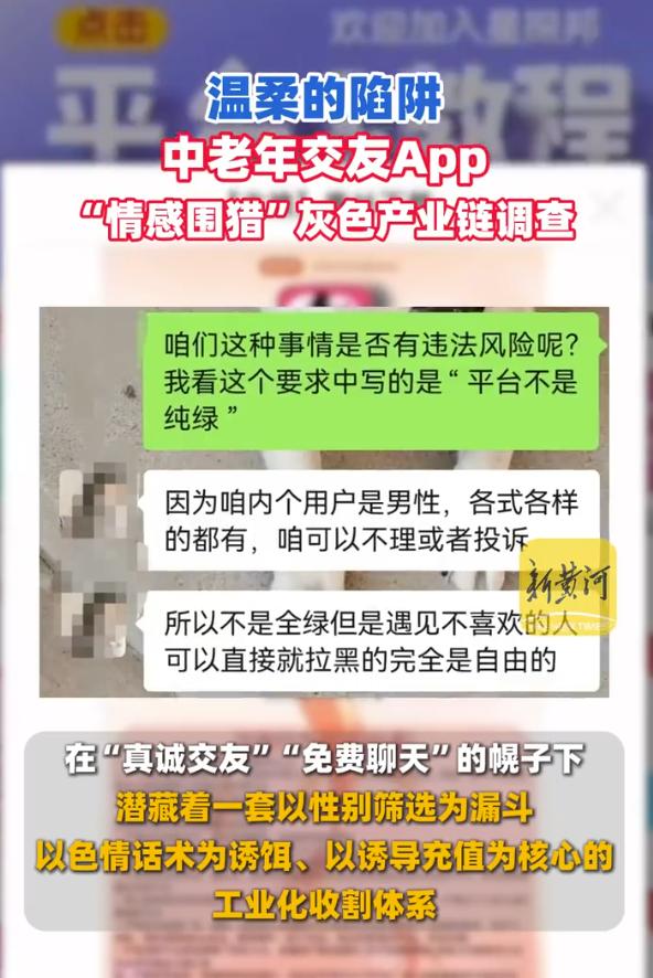 "大哥在吗,一个人好孤单""晚上没人陪,想找个人说说话"……这可不是什么迟来的爱情,而是一场针对中老年男性的精准"围猎"。近日,有记者深入调查发现,多款中老年交友APP打着温情的幌子,背地里却在用裸露照片、诱惑语音疯狂敛财,揭开了一层令人作呕的灰色利益遮羞布。