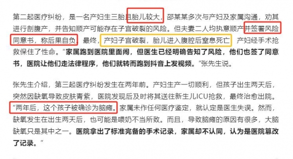 生的时候产妇子宫破裂,孩子窒息而死,他们就开始闹了,同样在网上发视频维权。