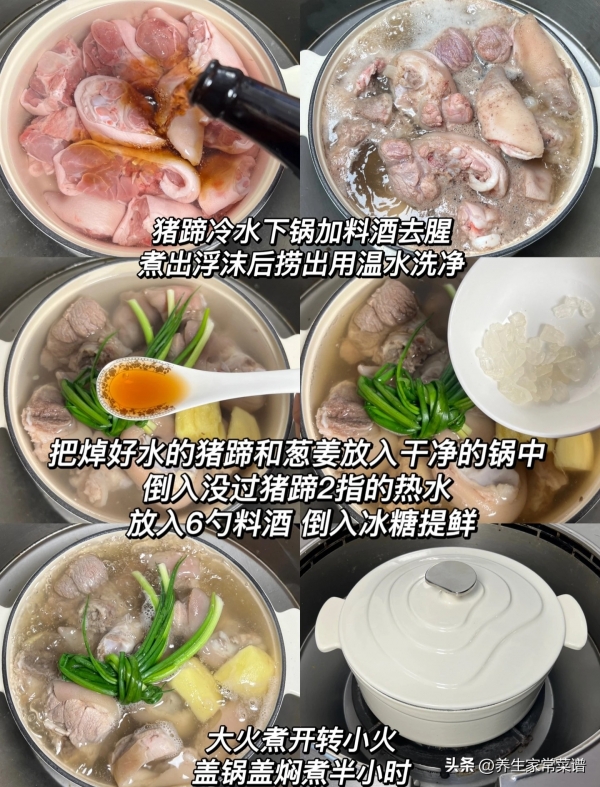 处理小技巧:猪蹄切块后,用冷水加一勺料酒泡30分钟,泡掉血水和杂质;焯水时加几片姜片,煮出的浮沫撇干净,炖的时候用小火慢炖,肉质更软糯。