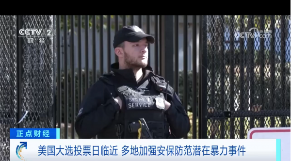 据央视网官方微博,11月5日是今年美国大选投票日,美国首都华盛顿特区各处加强戒备,严防可能发生的暴力事件。当地时间11月3日,在美国白宫外,工作人员安装了高约2.4米的金属围栏,围栏附近还有特勤人员把守。华盛顿特区警察局局长表示,特区大约3300名警察将实行12小时轮班制度,保证这个城市有足够的警力应对突发状况。