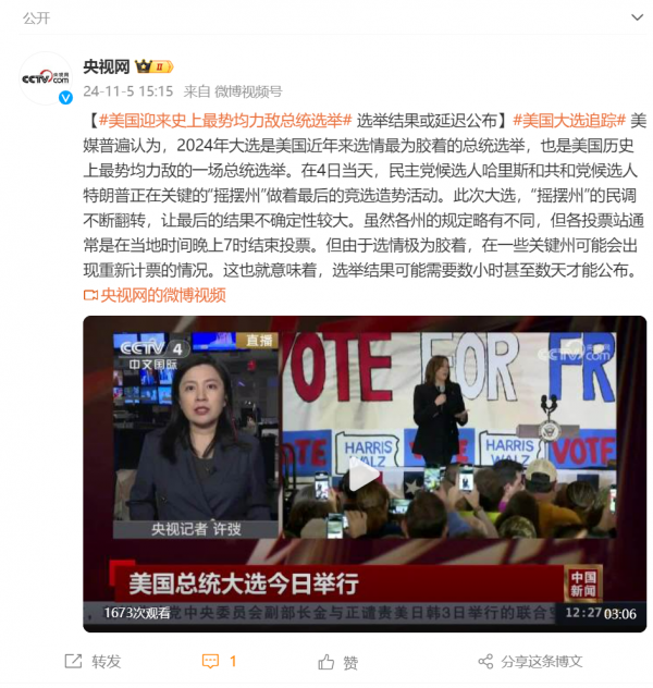 据央视网官方微博11月5日消息,美媒普遍认为,2024年大选是美国近年来选情最为胶着的总统选举,也是美国历史上最势均力敌的一场总统选举。