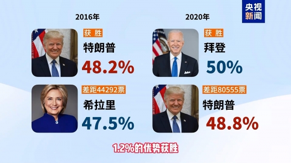 央视记者 徐德智:宾夕法尼亚在2016年前几十年选举中都是民主党获胜,直到特朗普。2016年特朗普以44292票,仅0.7%的微弱优势获得了宾州胜利。到了2020年,拜登则以80555票,1.2%的优势获胜。