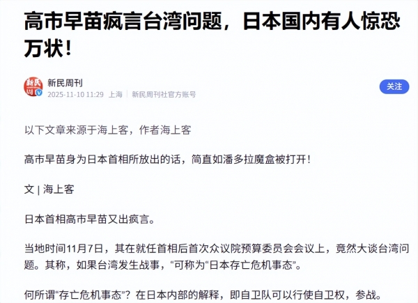 11月7日,东京的国会众议院会议厅内,高市早苗面不改色地宣布,如果台海发生冲突,日本可能会启动集体自卫权。