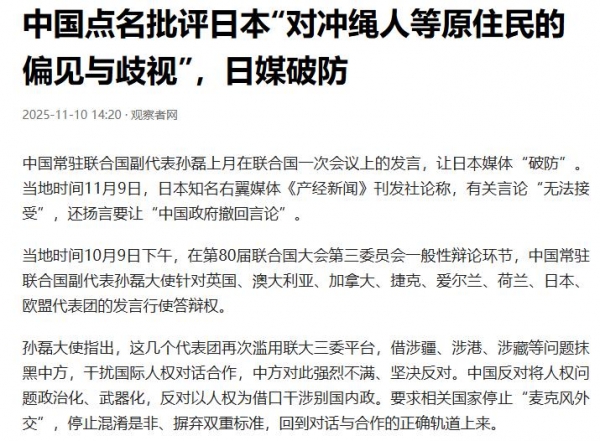 11月9日,中国常驻联合国副代表孙磊更是在联合国公开场合重新提起琉球问题--这是几十年来中国外交辞典中极少动用的"老问题",这次被重新摆上桌面,意味深长。