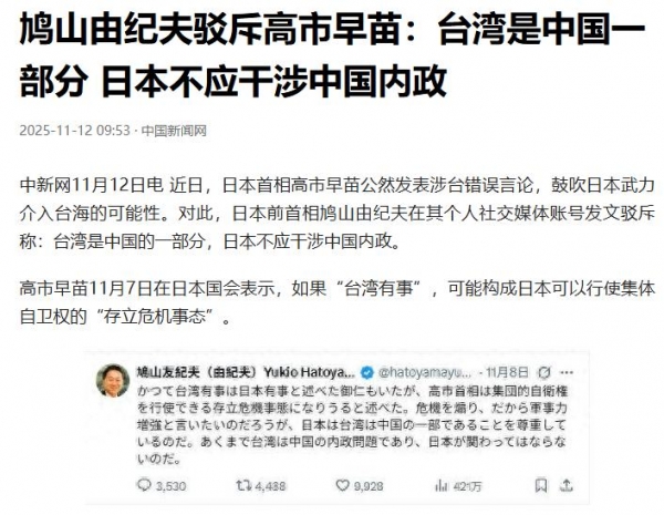 外务省连夜澄清,对台立场没有变化;高市拒绝道歉,但被迫承诺"以后不再发表类似言论";甚至连前首相鸠山由纪夫都看不下去了,公开发文警告政府不要干涉中国内政。