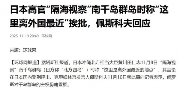 俄罗斯显然听懂了,11月10日,克里姆林宫发言人佩斯科夫淡定回应,重申俄罗斯对千岛群岛拥有无可争议的主权,还特意强调"领土问题没有讨论空间"。