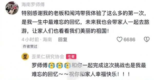 记者翻看罗师傅的微信朋友圈,发现他们于1月19日从海南出发,23日到了哈尔滨,他每天都会更新数条状态。1月24日,准备从哈尔滨返回海南的罗师傅发朋友圈感谢两位外国朋友,称给了他人生太多太多的第一次,他说两位外国朋友让他的人生变得不可思议。