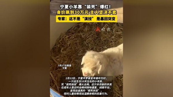 "会演戏的羊",身怀"装死绝技"……近日,宁夏平罗县宝丰镇中方村一只刚出生不久的"戏精"小羊羔走红网络,不仅身价飙升至30万元,而且,还成了社交平台上的"流量担当",甚至成了家乡的"宣传大使"。