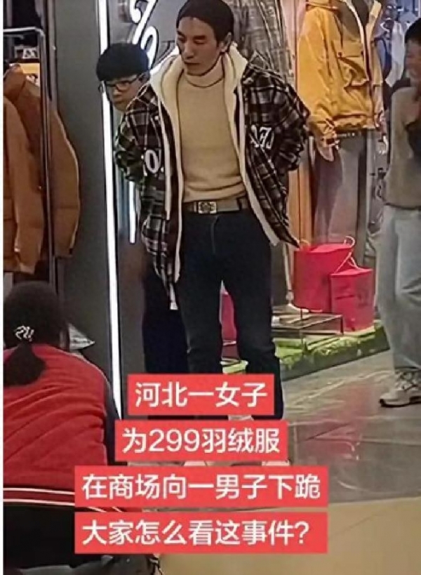 最初的版本,简单又粗暴:女人想买一件299块钱的羽绒服,丈夫不肯,于是她下跪乞求。