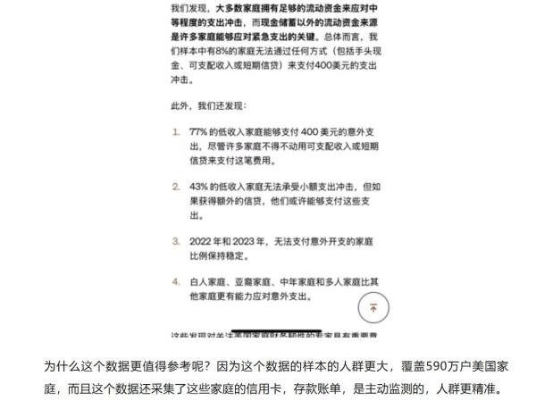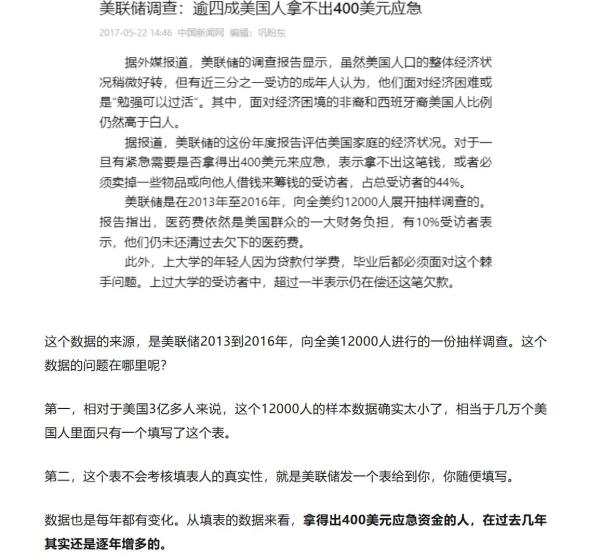 比如文章一个主要观点,是否认美联储调查的"将近四成美国人拿不出应急"这样一个结论: