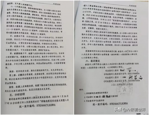 尸检报告指出,广泛心肌缺血是直接死因,而支架植入后引发的血管痉挛及血栓形成加速了病情恶化。
