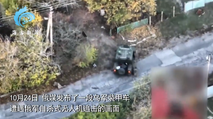 10月24日,俄媒发布了一段乌军装甲车遭遇俄军自杀式无人机追击的画面,画面中一名乌士兵见无人机来袭跳下车,另一名士兵也慌乱跳车被无人机高速撞击后倒地,幸运的是该无人机没有被引爆,只是高速动能撞击了一下士兵的臂部。