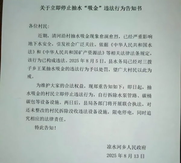通知称,清河沿村"抽水吸金"现象愈演愈烈,已严重影响地下水安全,并提到县水务局此前已对三拨子乡王某"抽水吸金"的违法行为予以处罚,要求村民立即停止违法行为、拆除相关设备,县局各部门将开展联合执法,否则将被限电停电并追责。