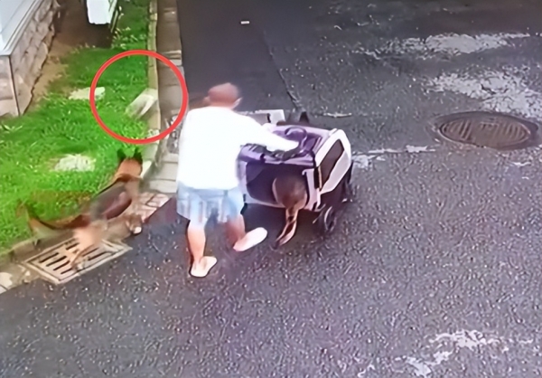那天跟往常一样,他牵着两只德牧在小区里慢慢散步,走到一个路转角时。