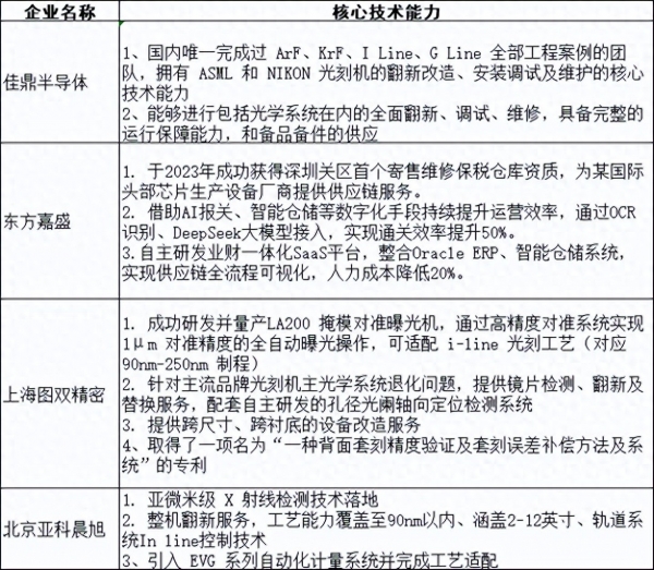 国内目前已形成以佳鼎半导体、东方嘉盛、上海图双精密等企业为核心的自主维修力量,其技术能力已通过实际工程案例验证,可不依赖荷兰技术与配件完成主流光刻机的维修维护。