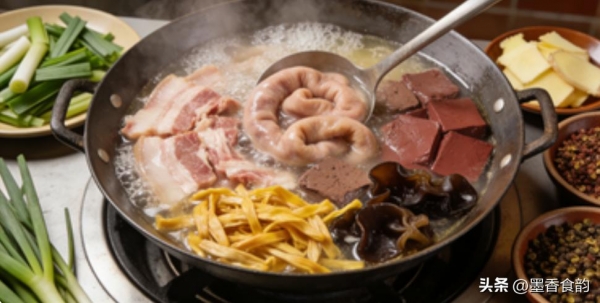 汤底做好后,先放猪肉片,煮至变色;接着下粉肠,煮约3分钟;然后放猪肝,猪肝一变白立刻下猪血;最后加入黄花菜、木耳等配菜。
