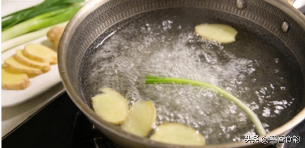 锅中加足量水,放入拍破的老姜、葱段,水开后保持中小火煮8-10分钟,让姜葱味道充分释放。不要用味精鸡精,原汁原味更好。