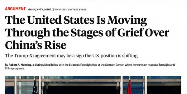 文章指出,美国已经走过了第一阶段的否认--当时美国幻想能够改造中国;以及第二阶段的愤怒--对中国全面强硬。