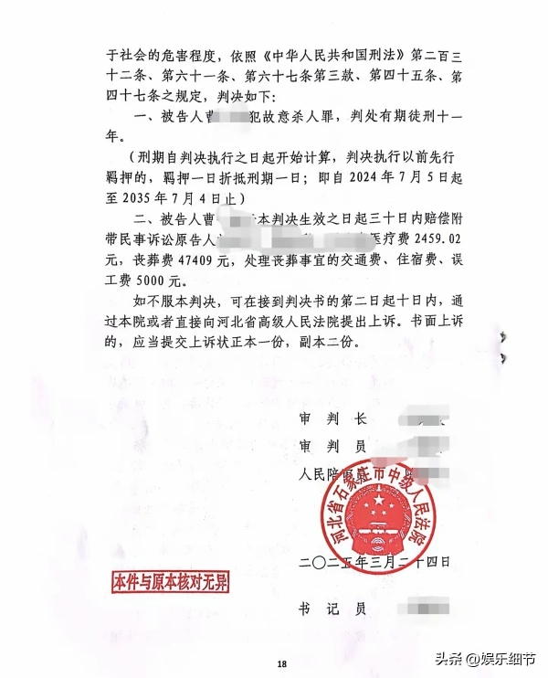 一审认定小曹构成故意杀人,判11年,赔偿5万4千余元。