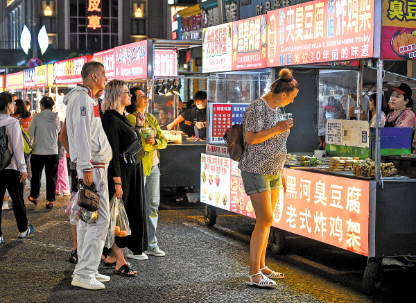 在黑龙江省黑河市,俄罗斯游客漫步在夜市中,享受着各种小吃和美食 China Daily