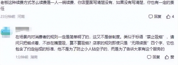 站在女顾客的角度,既然你餐馆定的规则是"免费续面",那就应该"无限续面"。可能正是由于女顾客对续面规则的这一解读,导致此事越闹越大,引发舆论的关注。目前多数网友支持"如果每人一碗面,正常。但如果总共点一碗面,一直薅羊毛,是有点过分!毕竟人家也是做生意的"这一观点。