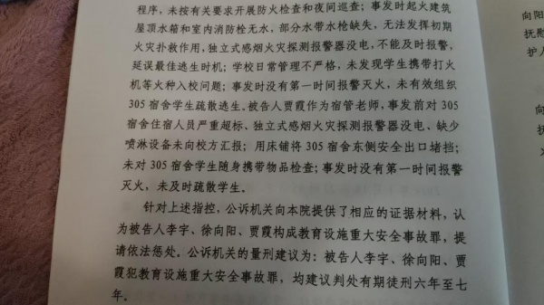 12月25日,观察者网从一位遇难学生家长处获得的一审判决书显示:公诉机关认为,被告人贾霞作为宿管老师,事发前对305宿舍住宿人员严重超标、独立式感烟火灾探测报警器没电、缺少喷淋设备未向校方汇报;用床铺将305宿舍东侧安全出口堵挡,未对305宿舍学生随身携带物品检查;事发时没有第一时间报警灭火,未及时疏散学生。