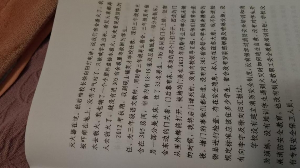 贾霞还承认,"被堵的门是在2023年秋期学生开学分配床铺的时候,我将后门堵死的。没有向校领导汇报,但他们经常去查寝,堵门的事他们都知道……我不知道按规定标准应该住多少学生。宿舍没有安装感烟器及喷淋设施,没有向李宇及徐向阳汇报过。"
