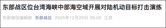 微信公众号"东部战区"消息,12月29日,中国人民解放军东部战区位台湾海峡中部海空域,组织歼击机、轰炸机、无人机等兵力,协同远程火力,开展对陆机动目标打击演练,检验了精打击要能力。