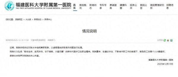 12月10日,福建医科大学附属第一医院官网发布情况通报:近期,我院依规依纪对张水华违规兼职取酬、以虚假理由获取调休问题进行处理。大象新闻记者注意到,疑似张水华本人抖音号显示,其现在有粉丝4.9万,她曾在首条置顶视频下公开表示,"作为一名单位员工,我今后会将工作与爱好分得更清,绝不会因个人事务影响工作。"