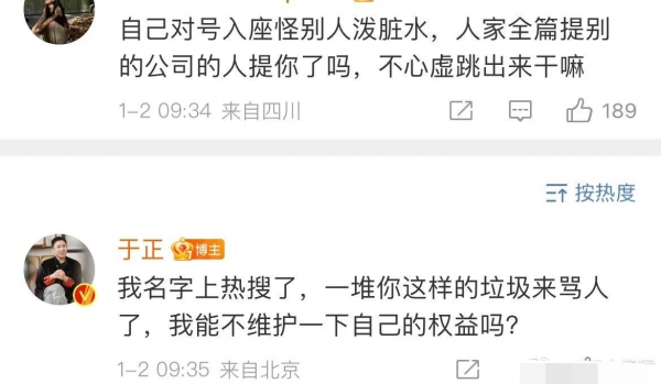 于正一见马上气得跳脚,毫不客气地反击骂他的人都是垃圾,自己的名字都上了热搜了难道自己还不维护自己的权益?
