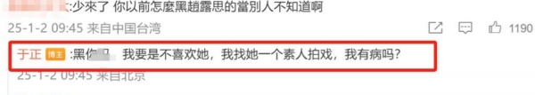 有网友旧事重提于正当年黑赵露思"当别人不知道啊",于正立即爆粗口回怼,"不喜欢她还找她一个素人来拍戏?"看来于正是真的怒了,在评论区一个个回击网友,就像很憋屈一样。