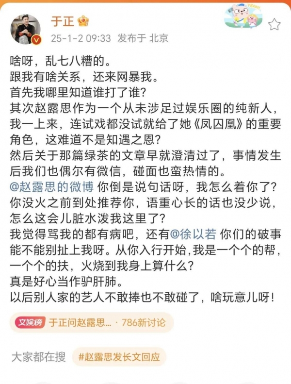 1月2日,于正受不了脏水都往他身上泼,发文表明自己也不清楚到底是谁打了赵露思,跟他一毛钱关系都没有,不明白怎么网友一早起来都来网暴他。