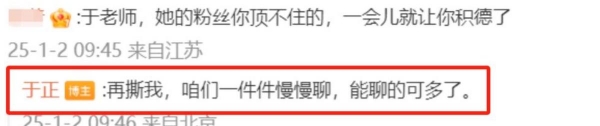 然而,以一敌万谈何容易,冷静下来后于正放下狠话,"要是再撕我,还有很多事能聊,我们一件一件慢慢聊。"貌似是在提醒赵露思粉丝,他的手上还有很多猛料,千万不要再惹他了,要不然后果自负。