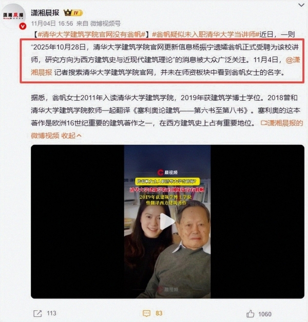 那天网上突然冒出"翁帆已入职清华建筑学院"的消息,没半天就冲上热搜。