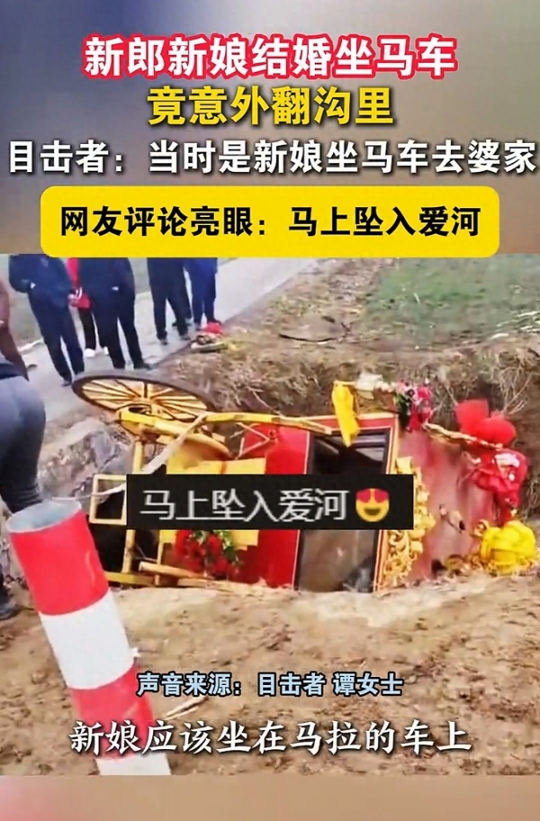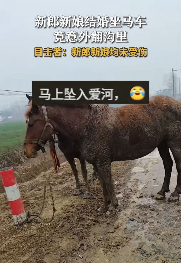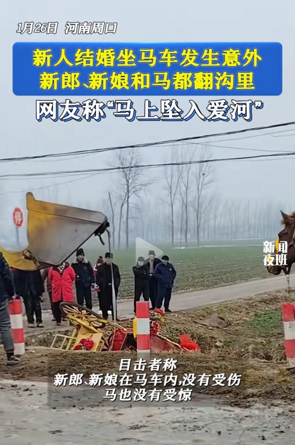 近日,河南周口一对新人乘坐马车举办婚礼,没想到在途中却来了一个人仰马翻,虽然婚礼突发小插曲,但是网友们还是送上了美好祝福,戏称这是现实版的"坠入爱河"。