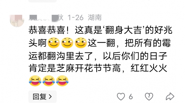 还有网友表示,这是翻身大吉,这一翻,所有倒霉的事都翻沟里去了,今后他们的日子肯定芝麻开花节节高,红红火火。