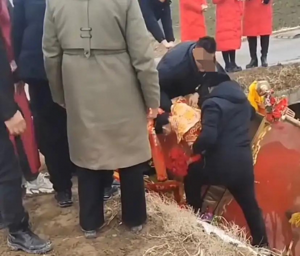 新郎倒是没啥问题,新娘出来之后,直接就从轿厢里爬了出来。