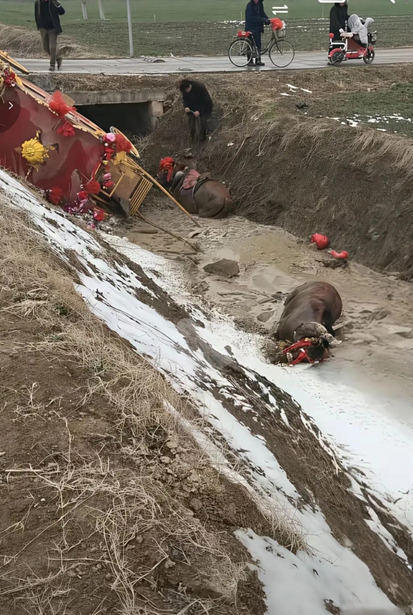 网传另一段视频显示,马车轿厢倒在水沟的半坡上,而两匹马则完全掉入水沟里。