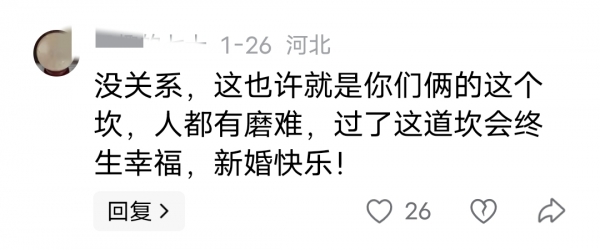 有网友表示,也许这就是他们的坎,现在过了这个坎,以后就会终身幸福了。