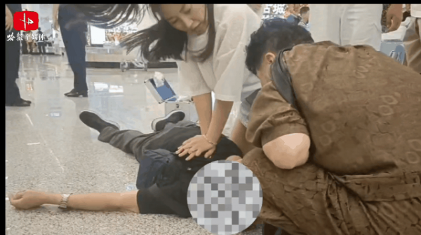 7月29日,在烟台机场,一位老人突然倒地不起,其伴侣焦急万分,不知所措。此时,哈尔滨的护士长林林正巧路过,她迅速上前,发现老人面色异常,呼吸和脉搏全无,且出现了失禁现象。