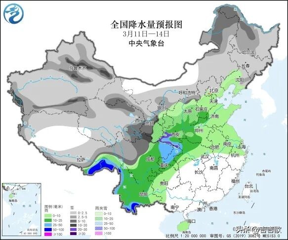 西北中东部、华北等地有雪或雨夹雪,局地暴雪;西南东部、江南等地降雨返场,局地大雨。