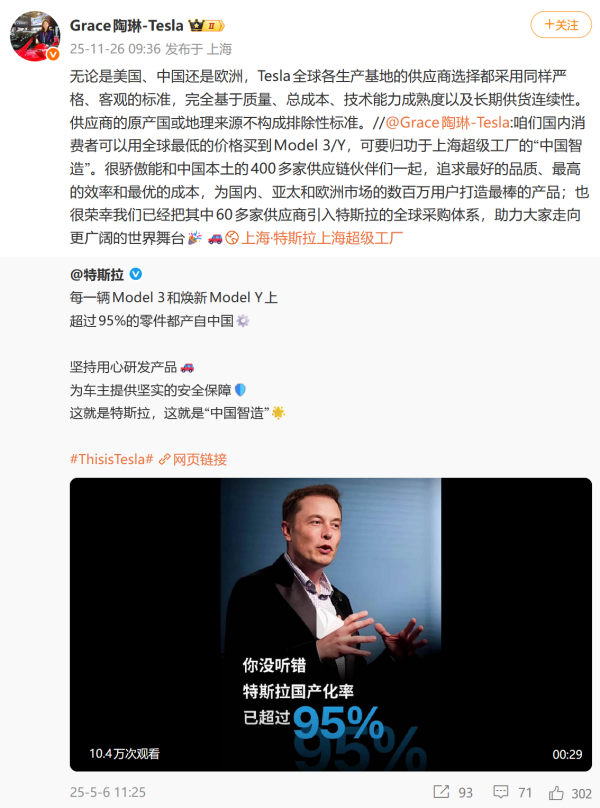 11月26日,特斯拉公司副总裁陶琳发布微博表示,"无论是美国、中国还是欧洲,Tesla全球各生产基地的供应商选择都采用同样严格、客观的标准,完全基于质量、总成本、技术能力成熟度以及长期供货连续性。供应商的原产国或地理来源不构成排除性标准。"