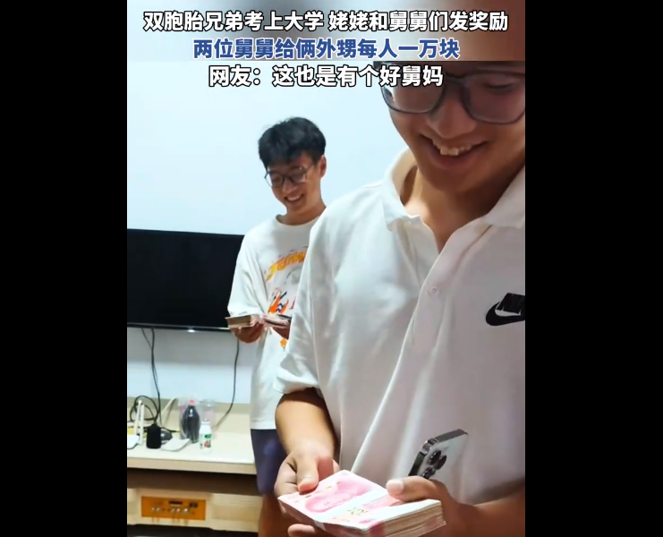 双胞胎兄弟考上大学,姥姥和舅舅们发奖励,两位舅舅给俩外甥每人一万块。网友:这也是有个好舅妈