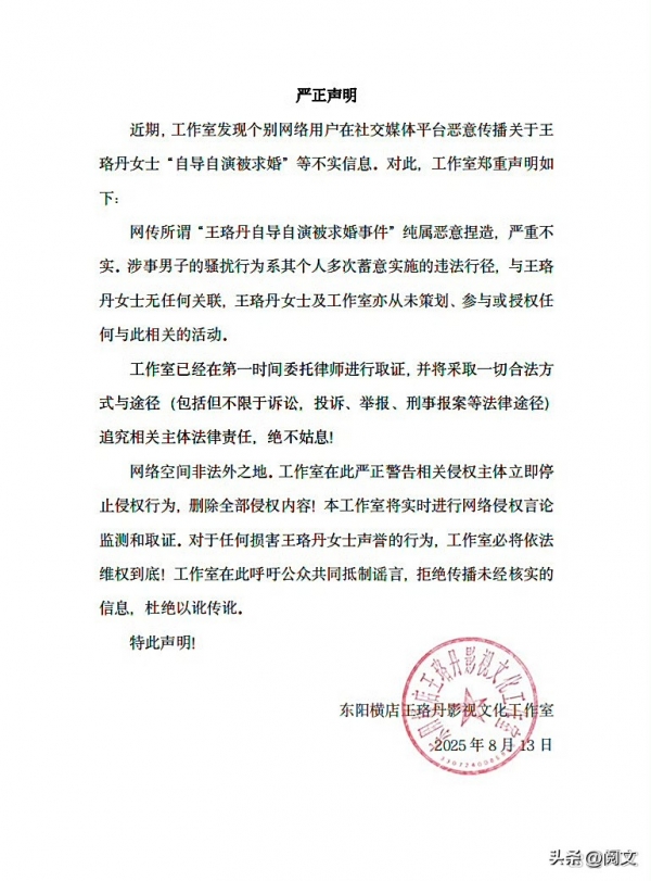8月13日深夜,王珞丹工作室 发文否认该质疑,称网传所谓"王珞丹自导自演被求婚事件"纯属恶意捏造,严重不实,并称已委托律师取证,将追究相关主体法律责任。