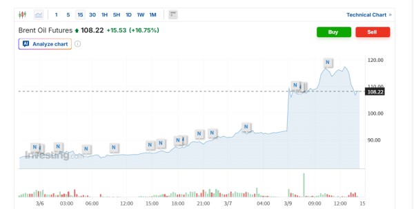 布伦特原油在9日的亚洲交易时段飙升24%,至每桶116.71美元,但在七国集团即将召开会议的消息传出后稍有回落,涨幅仍接近19%,至每桶110.85美元。作为美国基准的西得克萨斯中间基原油上涨28%,至每桶116.45美元,随后回落至每桶108美元左右,涨幅接近19%。